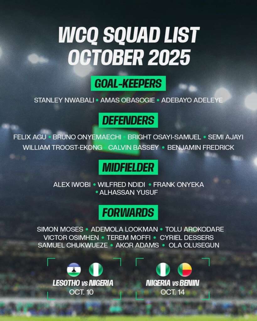 Nijerya Milli Takımı’nın 10 Ekim ve 14 Ekim’de oynayacağı maçların aday kadroları açıklandı.