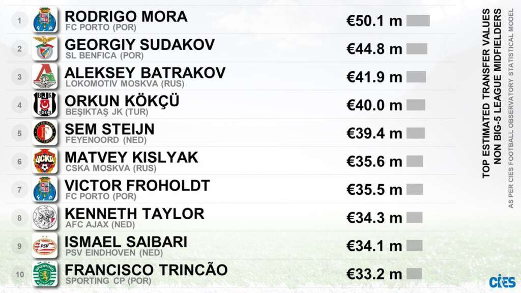 CIES Football Observatory’nin yayımladığı son rapora göre, Beşiktaş’ın genç yıldızı Orkun Kökçü, Avrupa’nın büyük 5 ligi dışındaki en değerli orta saha oyuncuları arasında 4. sırada yer aldı. Tahmini transfer değeri 40 milyon euro olarak açıklanan Kökçü, listede Porto’dan Rodrigo Mora, Benfica’dan Georgiy Sudakov ve Lokomotiv Moskova’dan Aleksey Batrakov’un ardından geliyor.